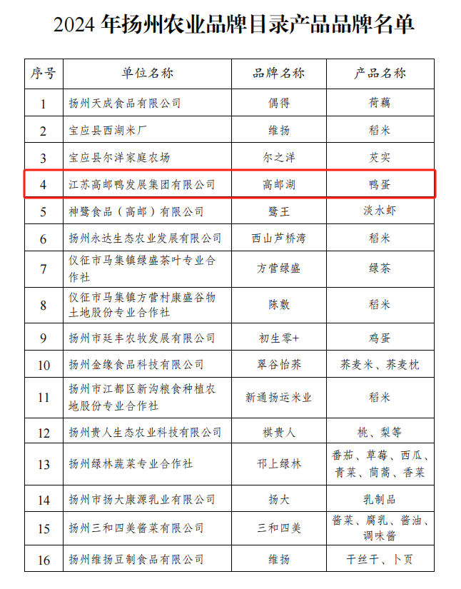 近日,揚(yáng)州市農(nóng)業(yè)農(nóng)村局公布了2024年揚(yáng)州農(nóng)業(yè)品牌目錄名單,高郵鴨集團(tuán)“高郵湖”品牌鴨蛋成功入選目錄名單。