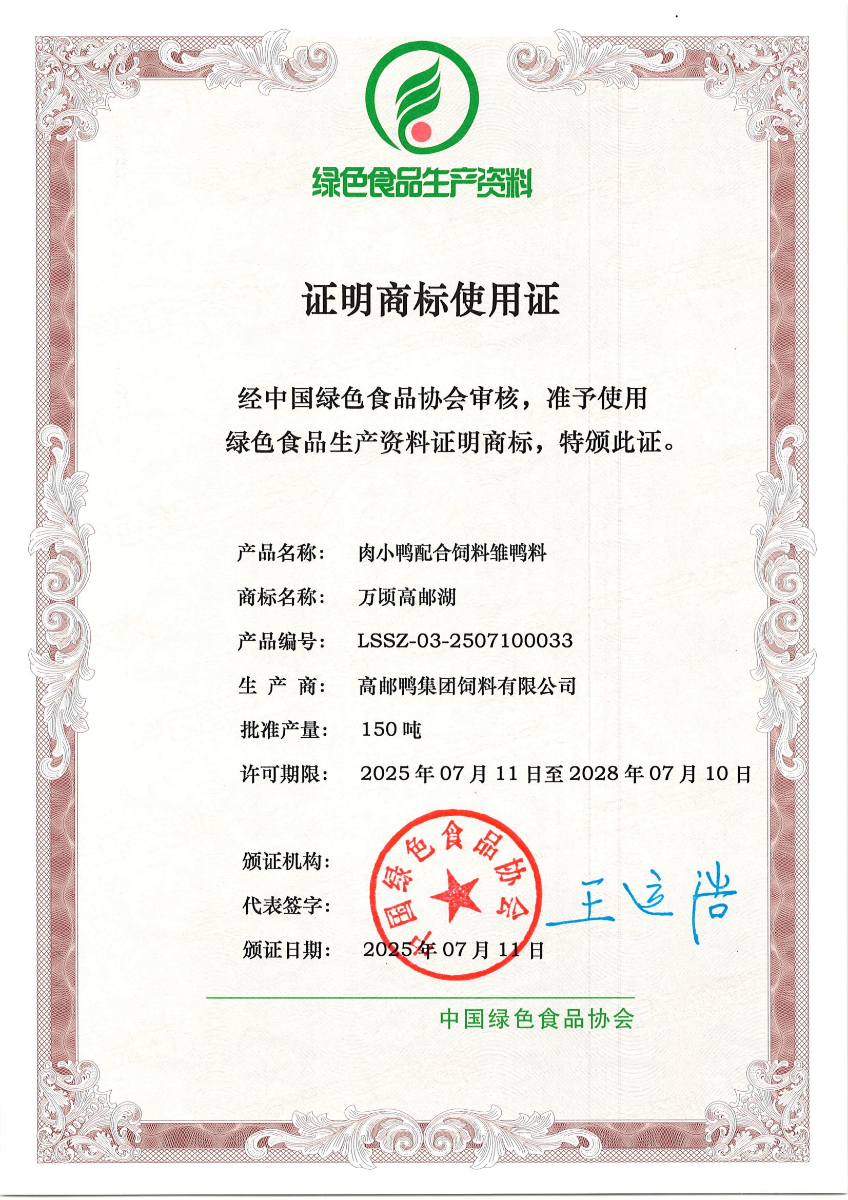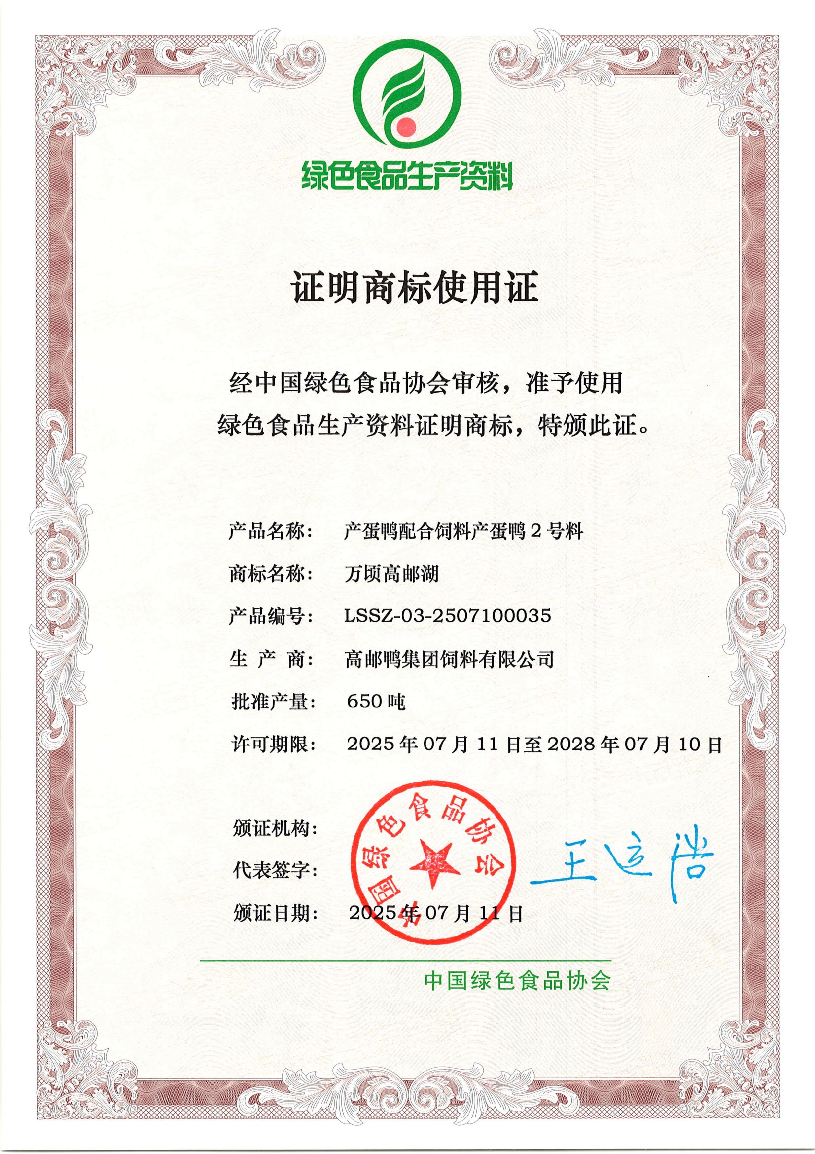近日,高郵鴨集團申報的蛋鴨配合飼料成功通過中國綠色食品協(xié)會的最終審核,并獲得綠色食品生產(chǎn)資料證明商標(biāo)使用證。這一“綠資”認(rèn)證是國家層面認(rèn)可的綠色食品生產(chǎn)投入品的最高級別認(rèn)證之一,為高郵鴨集團產(chǎn)品進入高端農(nóng)產(chǎn)品生產(chǎn)供應(yīng)鏈、拓展綠色食品相關(guān)市場提供了關(guān)鍵資質(zhì)支撐。